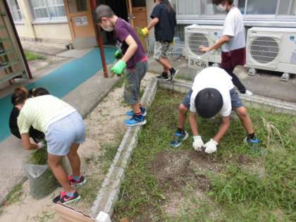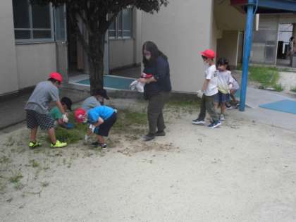 有栖川の横にある小径や校舎の陰などいろんなところに生えている草をみんなで抜きました。土が固いところはなかなか抜けないようで「先生、かたくてぬけない」と言いながらも一生懸命、がんばってくれました。