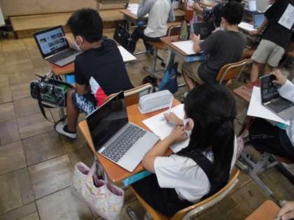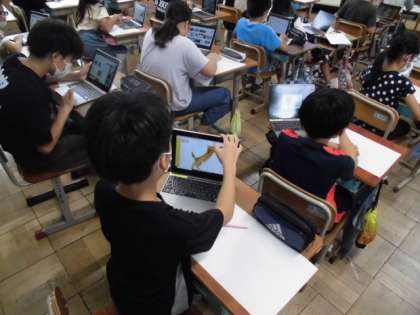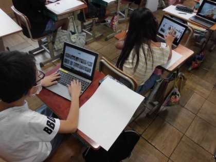 お話に出てくる「ねずみ」はどんなネズミだろう。図工では、お話から想像した場面を絵にすることに取り組んでいます。今日は、自分が想像したネズミの下絵を描きました。「ねずみ」という言葉だけで想像するのは難しいので、タブレットを使って調べた画像も参考にしていました。