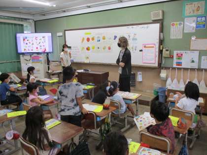 今日はALTのアンディ先生と一緒に授業をしました。食べ物の英語の表現を知ったり、好きな食べ物は何かを英語で尋ねたりしました。アンディ先生が選んだ食べ物を当てるゲームでは、英語の表現をよく聞いて、自分の選んだものと合っているか確かめていました。正解したときは「やったー!」と大盛り上がりでした。楽しみながら英語の表現に親しんでいました。