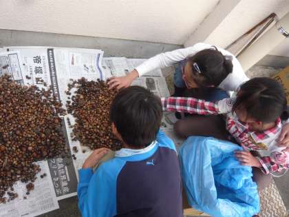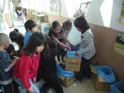 今日の子どもボランティア活動でも4年生の子どもたちが大活躍をしました。今日は,福島の小学校に送るどんぐりやまつぼっくりをダンボールにつめる作業のお手伝いをしました。子どもたちは気持ちを込めて箱につめたり天日干しをしたりして元気いっぱいに活動しました。