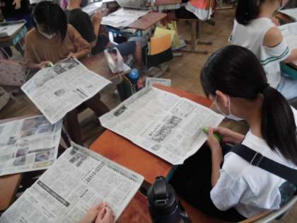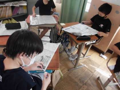 家庭科の時間には、トートバッグを作ることにしました。今日は新聞紙を使って、布を折るところや縫うところなどを確かめました。順序よく作ることで1枚の新聞紙がバックの形になっていきました。ちょっと難しいところは、グループで声をかけながら作業を進めていました。