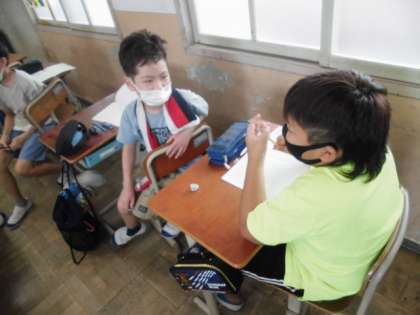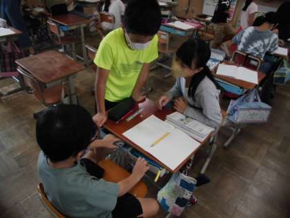 算数の時間には、これまでの学習を生かして問題に取り組みました。1m間隔で並んで「L」という字の人文字を作る時、何人必要か考えました。自分が考えたことを周りの人と交流しながら考えを深めていました。