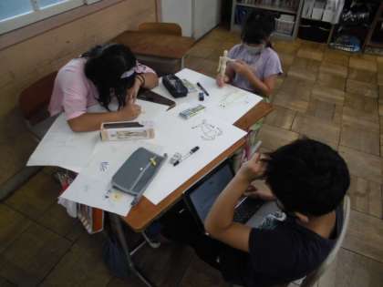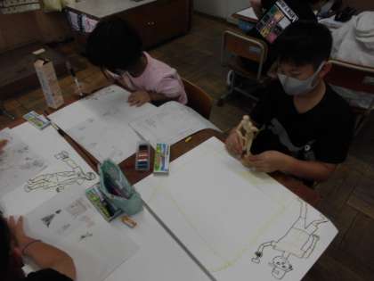 今日の図工では、動きのある人をコンテやマイネームで描きました。歩いたりジャンプしたりポーズをとったりする時、体はどのように曲がりどのように動かしているのか人形を使って考えました。関節が曲がると足の角度がどうなるのかとても参考になっていました。