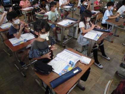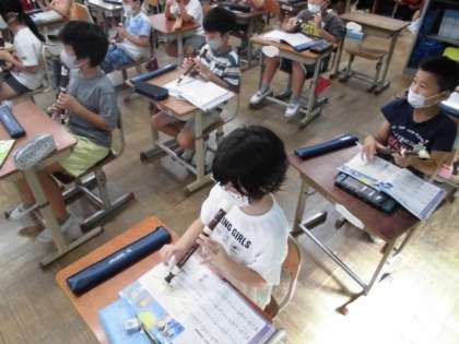 メロディーの変化を感じ取りながらリコーダーで演奏するために、指づかいを確認しました。「ソラシドレ」の5つの音が出てくるのですが、最後の「ラドレシ」の部分がうまくいきません。どの穴を押さえればいいのか分かっているだけに、「レ」で親指を話した後の「シ」の指が間に合わず、もどかしい思いです。何度も繰り返したりゆっくりしたり練習すると、だんだんできるようになってきました。