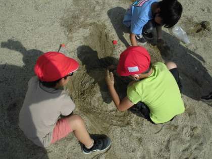 夏休みも終わり、秋に向かって涼しくなるかと思いきや日中はまだまだ暑い日があります。今日の生活科では、水とすなを使って遊びました。砂山を作って水を流したり砂に水を混ぜて団子を作ったりしていました。大きな団子やきれいな団子など作りたいものを作って楽しそうでした。