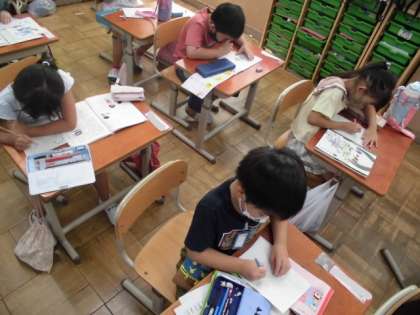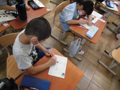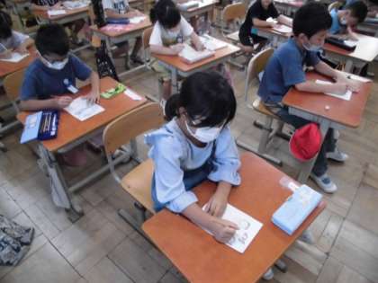 生活科の時間に水と砂で遊んだ後は、自分がどんな遊びをしてどんなことが楽しかったのか、カードに記録しました。友達と話しながら遊んだ様子を振り返って、楽しそうな表情で書いていました。