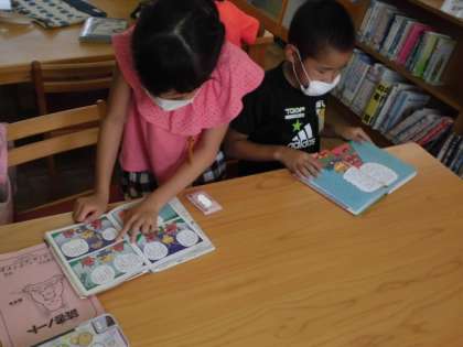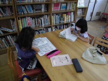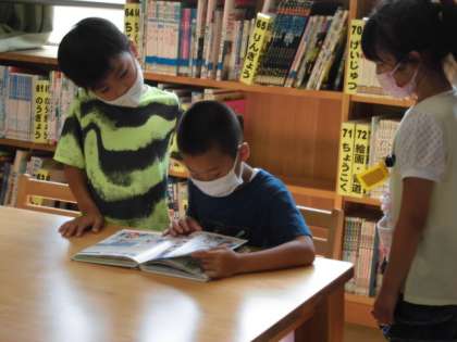 学校の図書館にはたくさんの本があります。今日も図書館に行って本を読みました。どの本にするかタイトルや表紙の絵を見て選んでいます。読みたい本が見つかったら、静かに集中して本を読んでいました。