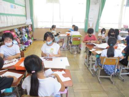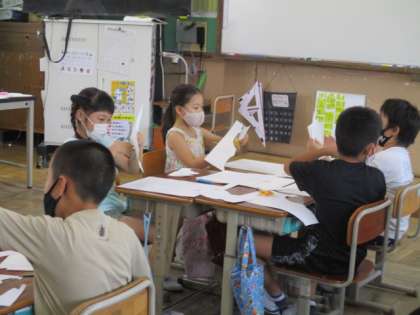 次に、切ってできた形をじっくり見てみると・・・。いろいろなものに見えてきました。置き方や並べ方の向きで見えるものも変わってきて、想像を広げて楽しむことができました。