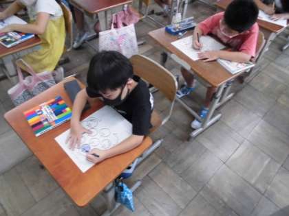 今日の外国語活動では、数字の言い方に慣れ親しむようにしました。配られたプリントには、たくさんのリンゴの絵が描かれています。自分でいくつか決めて色を塗りました。周りの人には見えないようにしておいてから、いくつ塗ったのか英語でやり取りしていました。自分と同じ数のリンゴを塗った人と出会ったら、チェックできるので喜んでいました。