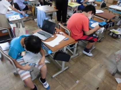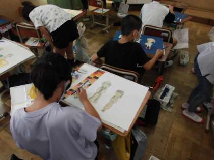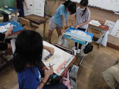 今日の図工では、構成を考えて下絵を完成させました。登場人物をどのあたりに描くのか木の大きさはどのくらいか、全体のバランスも考えながら構成を考えていました。