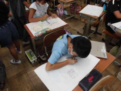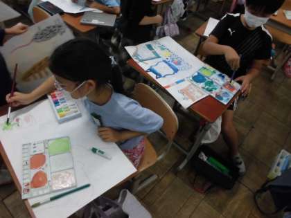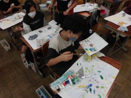 下絵もできたので、絵の具で色を塗っています。水の量を加減しながら濃淡を出したり色を混ぜていろんな緑を作ったりと考えながら塗るようにしていました。