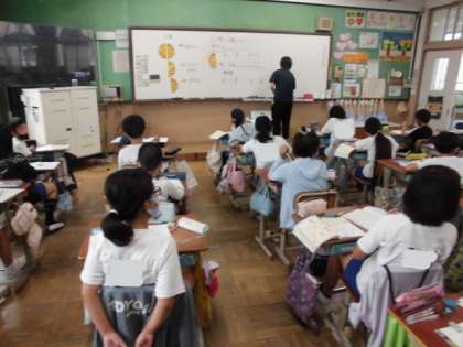 算数の時間には、ピザの絵を使って1/2に等しくするためにいろんな方法があることが分かりました。例えば、1/2をさらに半分に切った1/4と1/4を合わせて2/4にすると1/2と同じ大きさになりそうです。では、2/4と1/2にはどんな関係があるのでしょうか?分母と分子を見比べながら、「倍数」をヒントに考えていました。