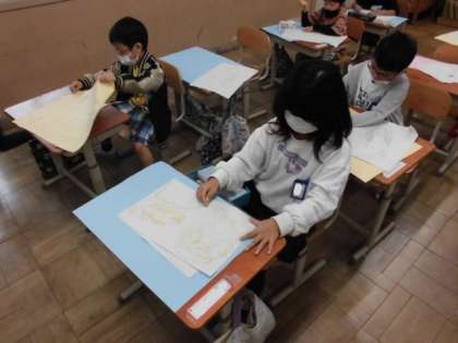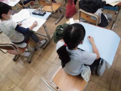 図工の時間には「お話の絵」に取り組んでいます。今日は下描きをもとにコンテで色画用紙に下絵を描きました。大きな紙なので、描きたいものを大きく描く必要があります。思っているよりも大きく元気よく描くようにしていました。いろんな動物が出てくる楽しそうな絵になりそうです。