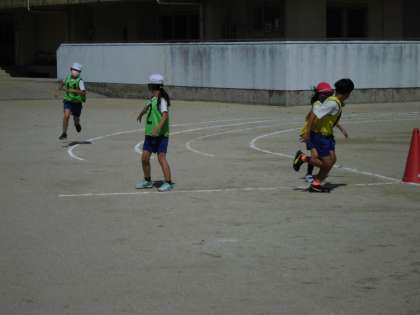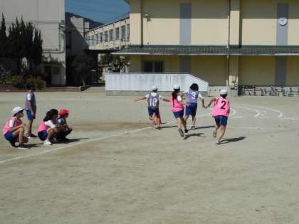 5年生はスポーツフェスティバルに向けてリレーの練習をしました。走順を確かめた後、2チーム対抗で走ってみました。みんなが内側を走るのではなく、割り当てられたコースをチーム内で相談して走っていきます。いろんなコースを走るので、バトンパスが難しそうですが、声を掛け合ってバトンをつないでいました。