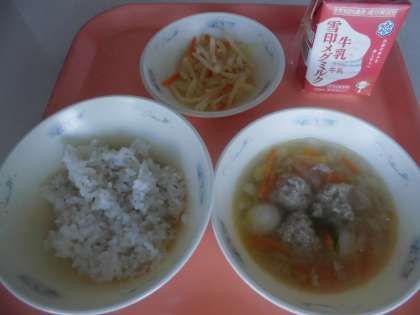 『肉だんごのスープ煮』は,豚ひき肉に塩・こしょう・しょうゆで調味して,料理酒・水を加えてねるように混ぜ合わせて,しょうが・玉ねぎ・片栗粉を加えて混ぜ,沸騰したお湯に肉だんごを作りながら入れて煮,はるさめ・うずら卵を加えて煮て仕上げました。