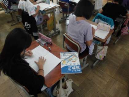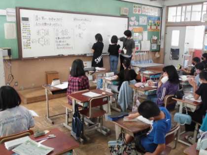 算数の時間には、15/20と同じ大きさで分母が20より小さい分数を求めました。この時、分母と分子を同じ数でわって分母が小さい分数を求まる方法を「約分」といいます。今日は約分をして求めるようにしました。