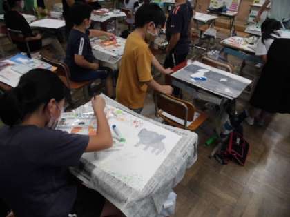 お話の絵に絵の具で色を塗っていますが、ちょっとした工夫を加えると、よりリアルに見えることがあります。草原を表現するために緑と黄緑を使うだけでなく、少しかすれるように塗っていました。また、水色に塗った空の一部分をわざと白色を使ってにじませることで雲を表現していました。