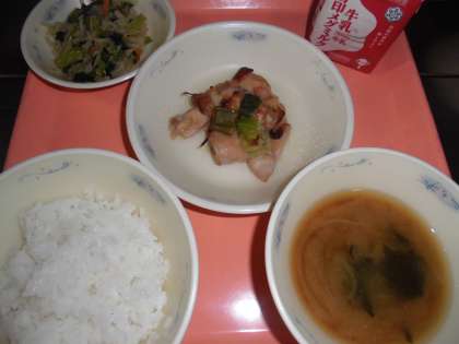 『鶏肉のてり焼き』は,さとう・しょうゆ・みりん・料理酒で下味をつけた鶏肉と白ねぎを混ぜ合わせて,スチームコンベクションオーブンで焼きあげました。あまからい味つけで,ごはんによくあいます。ふっくらとした鶏肉と,白ねぎのあま味を味わって食べました。