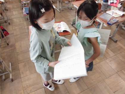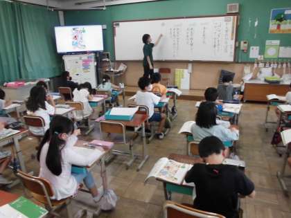 国語の時間には、「を」や「は」を使って正しく文を作りました。言葉を覚えるとそれを使って相手に意図を伝えるようにします。さらに、相手に分かりやすく伝えるためには単語だけでなく文でも説明できるとより伝わります。今日は、「を」や「は」を使った文をいくつか作り、友達と交流しました。長い文を選んで紹介している子もいました。
