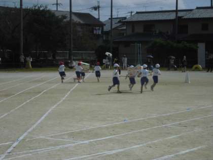 休憩をはさんで1年生のおみこしリレーですが、リレーの前に1年生のみんなでダンスをしました。これまで一生懸命に練習してきた成果を披露することができました。その後、4人組でおみこしを運んで次のグループと素早く交代するリレーをしました。勝利を目指してみんなで声を掛け合い、協力してがんばりました。