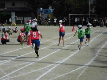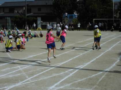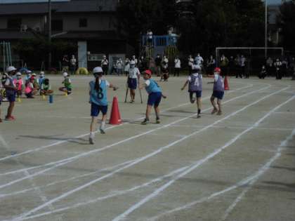 休憩をはさんで、5年生のワープリレーです。チーム内で走るコースを割当てて走るので、走る人によってコースが違います。たまたまアウトコースとインコースが重なると、相手チームとの差が縮まったり、逆に開いたりするので、最後まで分かりません。練習を開始した頃よりずいぶんとバトンパスが上手になったので、とてもスムーズにバトンがつながるようになりました。
