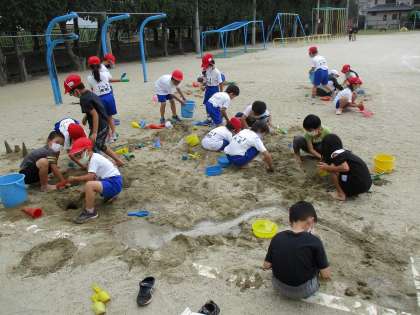 今日は運動場の砂場で、乾いた砂や水をかけた砂の感覚を楽しんだり、思い思いに自分のイメージしたものを造っていました。川を造って水を流したり、トンネルを掘って貫通させたり、砂の塊を積み重ねて建物を造ったりと、夢中になって活動をしていました。