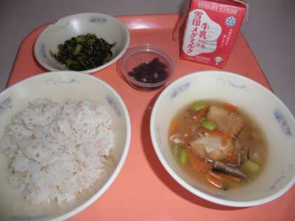 『厚揚げの野菜あんかけ』は,けずりぶしでとっただし汁・シイタケの戻し汁・さとう・しょうゆの煮汁で,にんじん・玉ねぎ・しいたけを煮,別の釜でけずりぶしでとっただし汁・料理酒・みりん・しょうゆで煮た厚揚げ・えだ豆を加えて煮,水溶き片栗粉を加えてとろみをつけて,しょうがの絞り汁を加えて仕上げました。