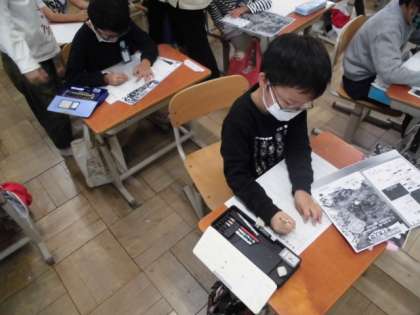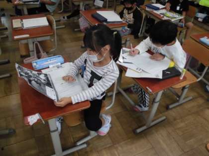 国語では生き物をテーマにして学習を進めています。今日は、図鑑から自分で選んだ生き物について、どこに隠れているのか?どんな様子なのか?読み取ってプリントに書くようにしました。教科書とは違って、どこに書いているのか自分で読んで見つけなければなりません。生き物の名前を書いた後、見落とさないようにゆっくり読み、見つけたことを書いていました。