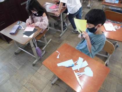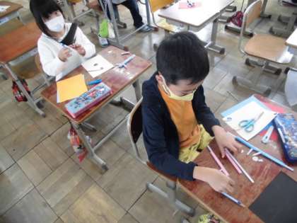 今日の午後から図工でパタパタする仕組みをストローで作りました。できたストローには色画用紙でかざりをつけていきました。色画用紙を切ったりセロテープで貼ったりと細かい作業があるので、慎重に進めていました。