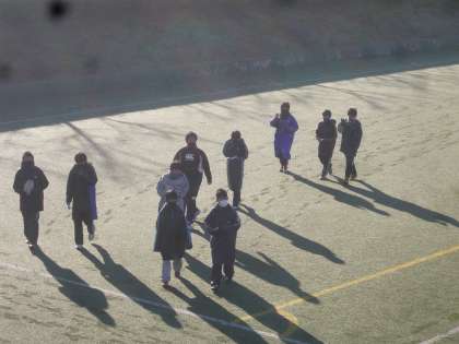まずは,試合に向けてのウォーミングアップです。子どもたちは緊迫した雰囲気の中しっかりグランドを走り体をあたためることが出来ました。決勝リーグ戦初戦に向けて本当にいいアップが出来ました。