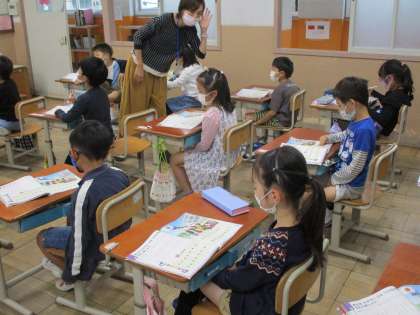 今日は「ひのまる」を歌いました。ドレミの階名で歌いながら、曲が盛り上がる高音部分を明るく伸びやかな歌声となるようにしました。はじめはうまく声が出ませんでしたが、何度か「犬の遠吠え」をして高音の声の出し方のコツをつかむと、きれいな歌声が出るようになっていました。