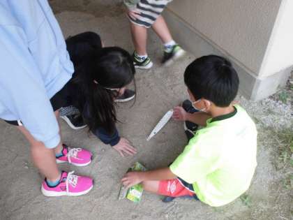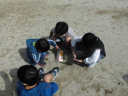 週末、雨が降っていましたが、今日はさわやかな秋晴れとなりました。朝は少し肌寒いぐらいの気候で季節が夏から秋になったと感じられます。今日の理科では、日なたと日かげの様子を調べました。明るさや温かさ、しめりぐあいを比べてみると、違いがよく分かりました。また、温度計を使って地面の中の温度を計りました。温度を計る時は、少し土を掘って温度計の先を埋めてから計るようにしていました。