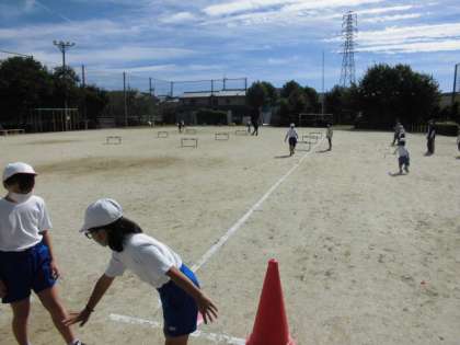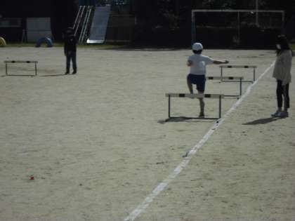 「ハードルに引っかかるのが怖い」という思いが先立ち、思い切って走りながらまたぎ越すことが難しいハードル走が始まりました。どちらの足で踏み切るのか、何歩で跳べるのか、子ども達が考えながら取り組んでいけるようにしたいと思います。