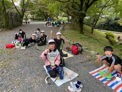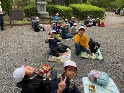 浄水場の見学を終えた4年生は、インクラインの坂を上がったところで昼食をとりました。琵琶湖疏水の設計を行った田辺朔郎の像に見守られながら、みんな笑顔でおいしいお弁当を食べていました。