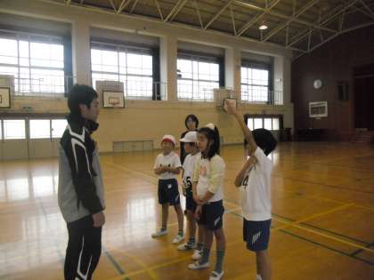 パスゲームをしました。チームの仲間にうまくボールをパスしながら、ゴールにシュートします。みんなルールを理解して対戦できました。ゲームの後、友だちのうまかったところ、上手だったところを話し合いました。最後はポートボールをしました。