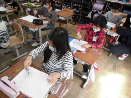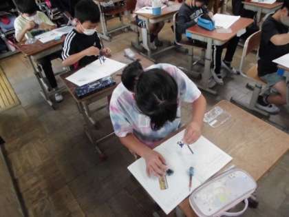 今日の算数では、コンパスを使ってまるい形を描きました。コンパスの先は針のようにとがっている方と鉛筆などで書ける方とがあります。針の方をノートにおいてから指先で上手にコンパスを動かして円をかくようにがんばっていました。油断すると、すぐに針の方がずれてしまうので、慎重に集中して描いていました。1つできたらコンパスに慣れるように何度も円を描いてコツをつかもうとしていました。