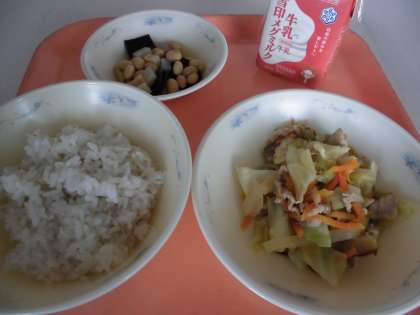 「『豚肉とキャベツのみそいため』は,具がたくさん入っていて,おいしかったし,味もしみていて,おいしかったです。『五目煮豆』は,大豆にも味がしみこんでいて,おいしかったです。」と,感想をくれました。