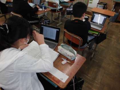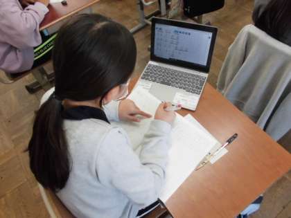 算数の時間におさらいをしました。問題を読んでノートに式や答えを書いていきます。できたら先生からロイロノートで送られてきた答えを見て、自分で答え合わせをしました。間違っているところは、どこが間違っているのかもう一度考え直していました。