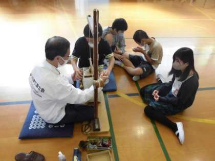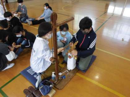 今日は体育館で「京くみひも」の体験をしました。伝統工芸品でもある「くみひも」について説明を聞いてから実際に制作しました。最初はどのような順番でひもを動かしていくのか戸惑いもありましたが、慣れてくると作業もスムーズになっていました。できた「くみひも」を見て満足気な表情を浮かべていました。学習の最後には、世界に1つだけの「くみひも」を手に感謝の気持ちを伝えました。