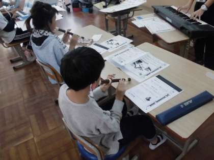 今日の音楽では、鍵盤ハーモニカやリコーダーを使いました。鍵盤ハーモニカでは「きらきらぼし」や「かえるのうた」を、リコーダーでは「きれいなソラシ」を演奏しました。早くなり過ぎないようにリズムに合わせて演奏するように心がけていました。