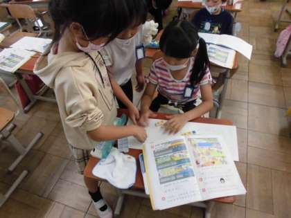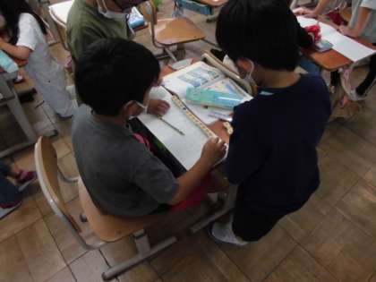 今日の算数では、1つの式で表しているたし算とひき算の計算をしました。たすのかなひくのかなと相談しながら数図ブロックを使って式の順番に計算しました。