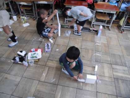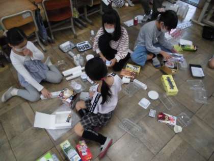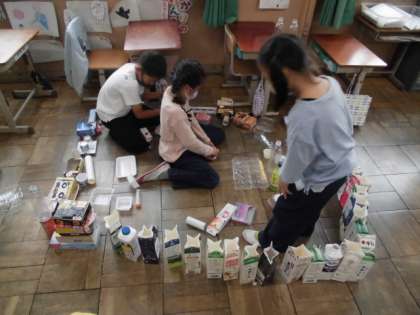 ペットボトルのキャップやトイレットペーパーの芯、空き箱、プラスチックの容器など、使用済みのものをたくさん集めました。今日は、それらを使ってどんな遊びができそうか考えました。組み立てたり積み重ねたり思いついたことをどんどん試してみました。その後、自分が見つけた遊び方をみんなに紹介していました。