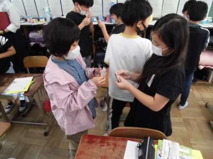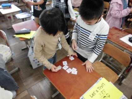 外国語活動の時間には、アルファベットに慣れるように自分の見つけたきまりで並べたり集めたりしました。字の形や特徴に目を向けることで少し覚えやすそうです。また、同じカードを集められるように「〜 please」と相手にいうと「Here you are」カードを渡してもらえます。お互いにやり取りしながらカードを交換していました。