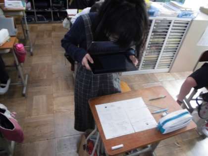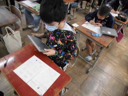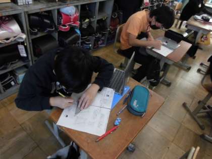 今日の算数では、図形の大きさを変えて作図する方法を学習しました。2倍や1/2にする時はどの辺も2倍や1/2にする必要があることを知り、比で学習したことを使うようにしていました。かけた人から図の写真を撮ってデータで提出していました。