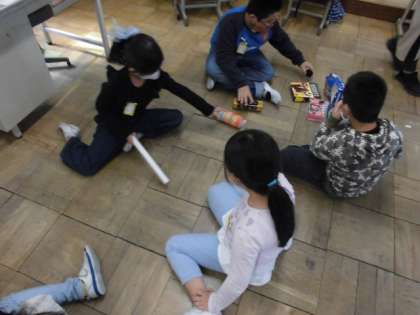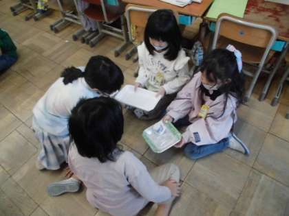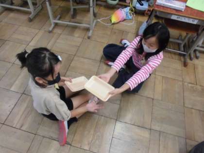 生活科では、キャップやペットボトル、トレーなどを使って遊べる方法を考えてきました。今日は、自分が考えた遊びを友達に紹介しました。何を使ってどのように遊ぶのか、お手本を見せたり使い方を説明したりしていました。1度やり方が分かると、夢中になって何度も遊んでいる子もいました。