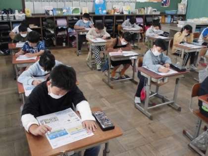 今日の理科では、学習したことを確かめるためにテストをしました。太陽が動くことによって影の位置が変わったり気温が変化したりいろんなことを学習しました。1つ1つ思い出しながら問題に答えていました。