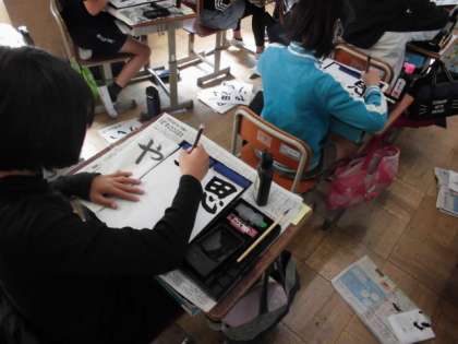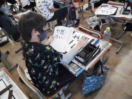 今日の書写では「思いやり」という字を書きました。いきなり習字道具を使って練習するのではなく、文字のバランスや書き順からの筆の運び方、気を付けるポイントなどを学習してから練習しました。できた字をもう一度自分で見直して、気を付けることができているか確認していました。