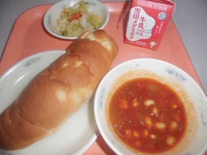 『大豆と牛肉のトマト煮』は,牛肉・ホールトマト・玉ねぎ・にんじんを炒めて,水を加えて煮,トマトケチャップ・ウスターソース・塩・こしょうで調味して,じっくり煮込んで仕上げました。ふっくらとした大豆と,トマトのこくを味わって食べました。