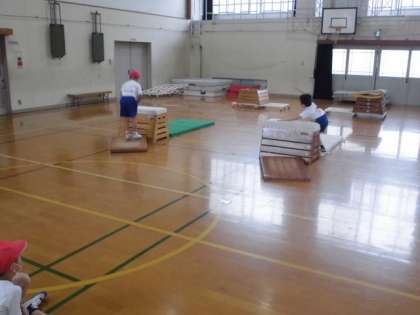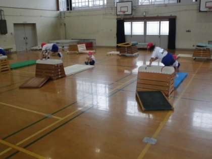 1年生はとび箱を使って学習しています。今日もみんなでとび箱やマット、踏み切り板を準備しました。安全に協力することで準備も早くなってきました。早速、横跳び越しや開脚跳びに挑戦しました。踏み切りがしっかりしてきたので、フワッと体が浮いている子が増えてきました。跳び終わったら安全確認して次の人へ合図を送るようにしていました。