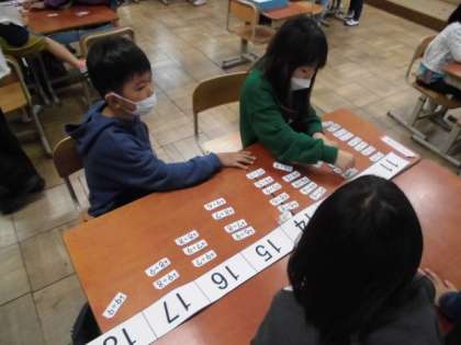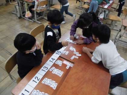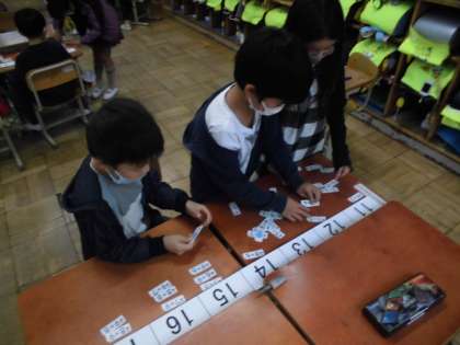 今日の算数では、20までのたしざんカードを使って同じ答えの式を集めました。計算したことをもとにグループで相談しながら順番も考えて並べました。並べ終わって全体を見てみると、カードの数にばらつきがあります。答えが大きくなるにつれて階段状になっていることに気が付いていました。